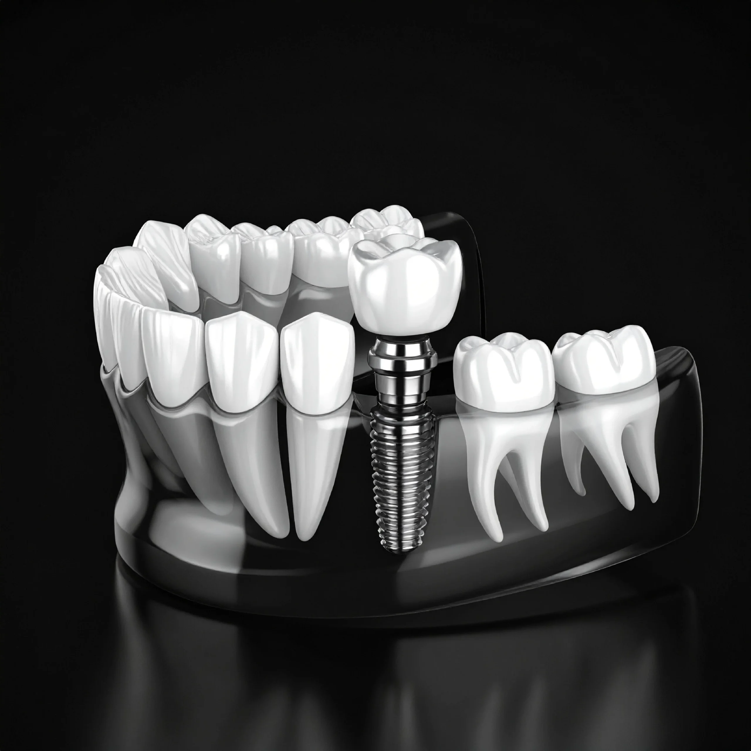 Sustitución de una pieza dental con raíz artificial de titanio y corona estética.